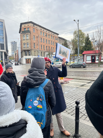 Dalej udaliśmy się na plac Kolegiacki, gdzie pan Czajko opowiedział o dawnej kolegiacie, która stała w tym miejscu. Usłyszeliśmy też historię Barbary Kani, wdowy po burmistrzu Poznania, która udała się na pieszą pielgrzymkę do Włoch; po powrocie ufundowała ołtarz w kolegiacie św. Marii Magdaleny.